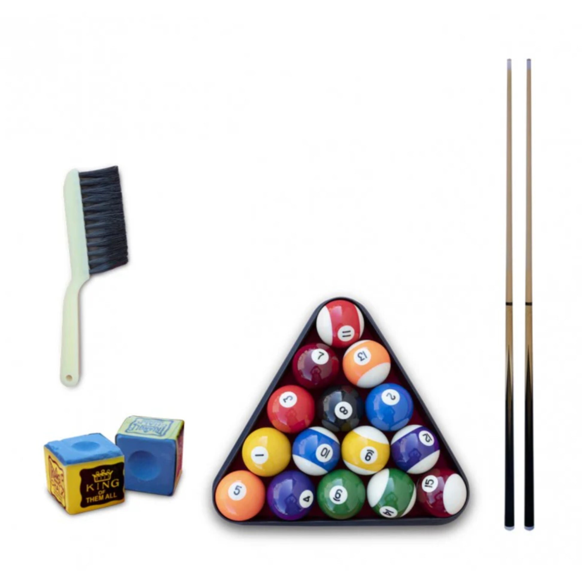 Includes 2x cues, brush, chalk, set of billiard balls and triangle.